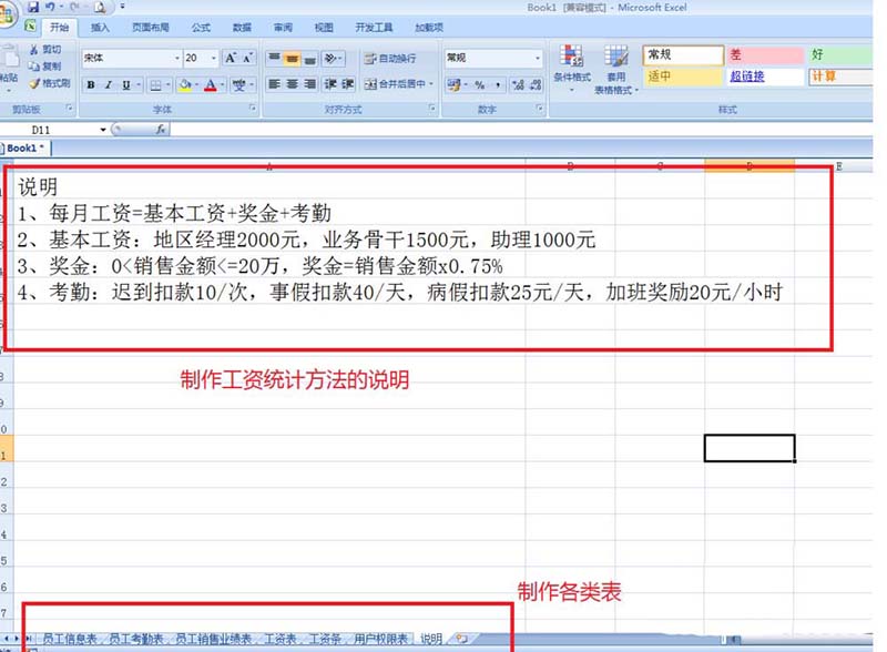 5、制作一张工资说明表,说明具体工作计算,发每月工资中基本工资的计算办法、奖金和考勤的奖罚处理办法等。