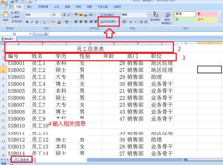 1、首先打开EXCEL空白表,然后把sheet1命名为员工信息表——接着合并A1:G1并居中,输入:员工信息表——A2:G2分别输入编号、姓名、学历、性别、年龄、部门、职位——然后输入各列的相关内容。