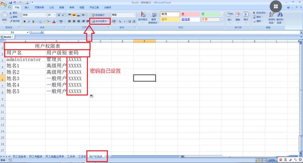 4、制作用记权限表,然后分配管理编辑表格的权限人员,新建一个表格命名为用户权限表——选择A1:A3合并居中——输入用户权限——然后A2:A3分别输入用户名、用户级别和密码。