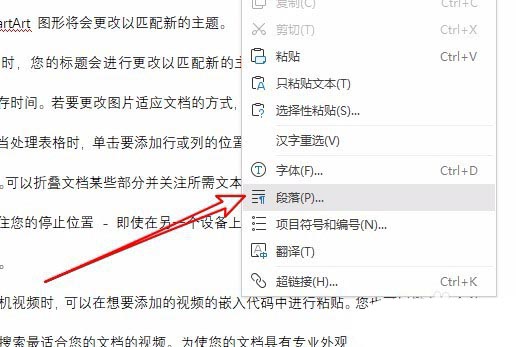 2、这时我们可以右键点击要编辑的段落,然后在弹出的菜单中选择段落的菜单项