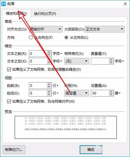 3、接下来在打开的段落窗口中点击缩进和间距的选项卡