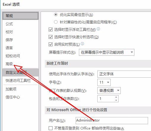 4、这时就会打开Excel2019的选项窗口,在窗口中点击左侧边栏的高级菜单项