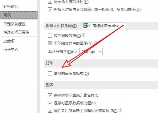 6、点击设置项前面的复选框,勾选该设置项。这样以后我们再打印表格的时候,表格中的图形就会非常清晰了