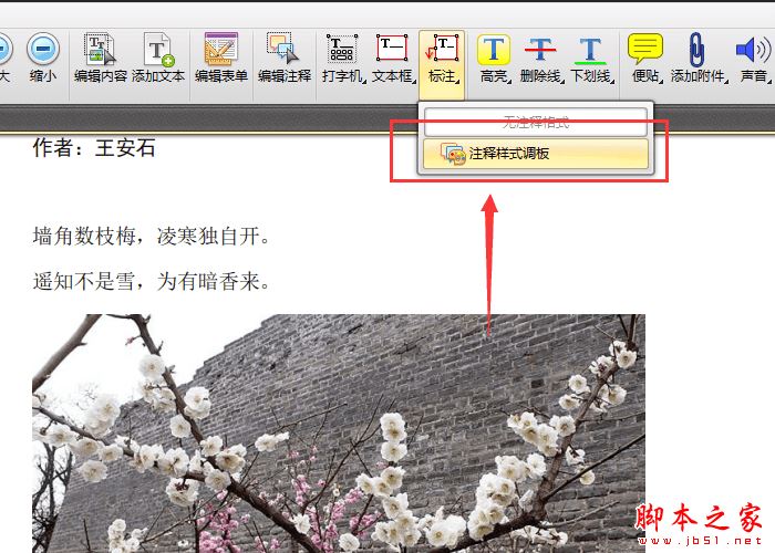 接着打开PDF文件之后,如果想要在PDF文件当中添加标注,那么需要右键点击界面里的“标注”选项,然后选择里面的“注释样式调板”按钮。