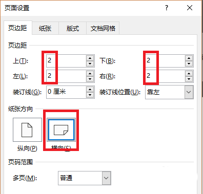 1、进入「布局」-「页面设置」,设置上下左右的边距为「2」,然后将「纸张方向」设为「横向」。