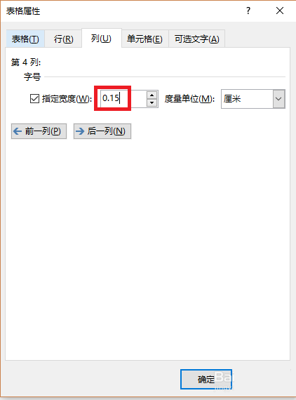 4、按住Ctrl键不松,用鼠标左键逐个选中第1、4、7、10列,然后「右键」-「表格属性」-「列」指定宽度设为「0.15」。