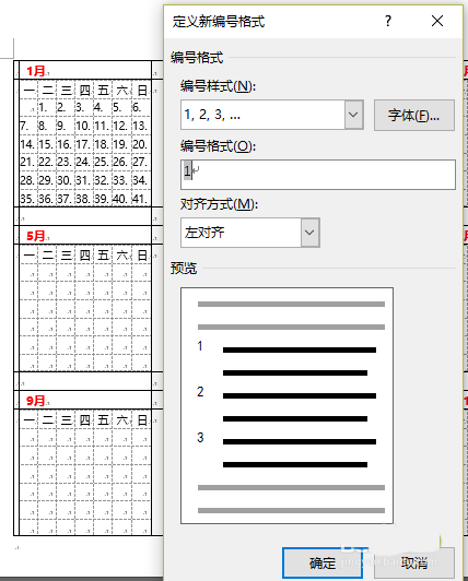 6、2019年1月份的1号是从星期二开始的,那么,我们就需要从星期二下方的单元格开始选中,直到后面所有的单元格,然后进入「开始」-「段落」-「编号」,我们选择「1.2.3.」这种样式,再进入「定义新编号格式」-将「编号格式」中1后面的「.」点删除掉。该月有31天,那么我们需要将31后面的单元格全部选中,点击一下「编号」按钮,即可取消后面的数字。