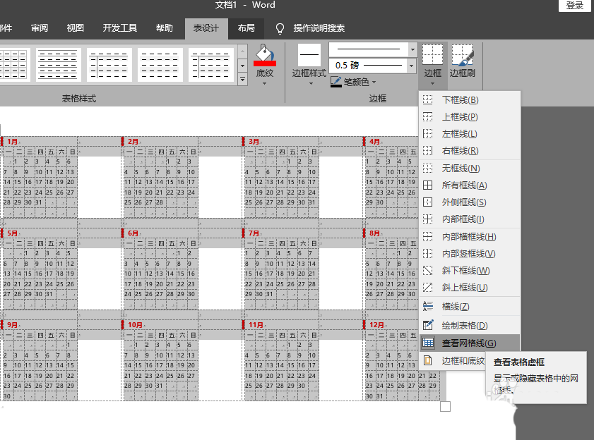 9、进入「表格工具」-「设计」-「边框」-「边框」-取消「查看网格线」。