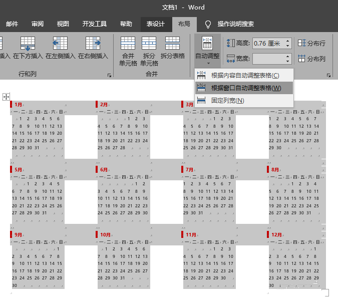 10、再次选中整个大表格,进入「表格工具」-「布局」-「单元格大小」-「自动调整」-「根据窗口自动调整表格」。