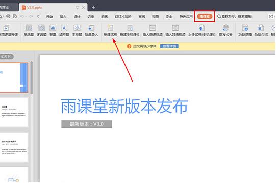 1、首先需要先将安装雨课堂软件,小编以WPS为列子,用户在安装完两个软件后,就可以在WPS上方的栏目中找到“雨课堂”,接着点击栏目下方的“新建试卷”功能,如下图所示: