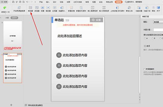 3、试卷模板建立完成后,接下来就是开始创建试题啦,在左上方可以添加不同的试题类型,点击单选题后,将会出现单选题的题目描述与答案选项,用户还可以根据试卷调整每个题目的分值与答案,如下图所示: