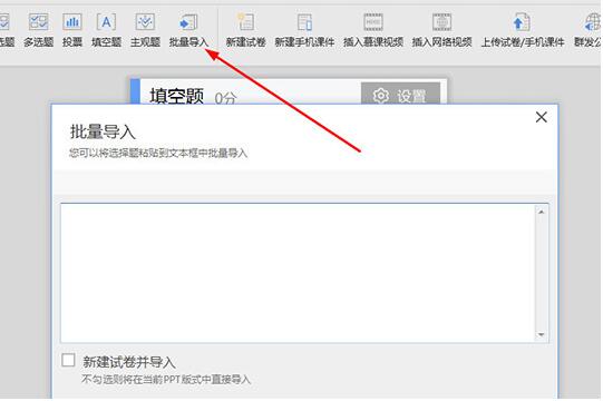 6、如果你想要批量导入题库,则可以点击“批量导入”选项复制选择题粘贴到文本框中即可,如下图所示:
