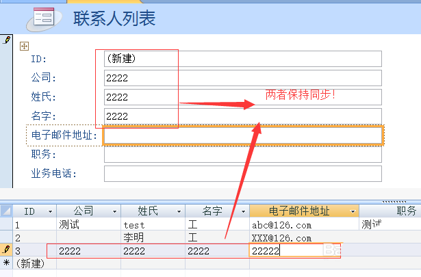 3、尝试着在数据表视图中新增记录,则窗体视图会保持同步。