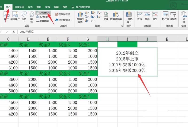 3、输入文字内容之后,我们点击上方的插入选择smartart。