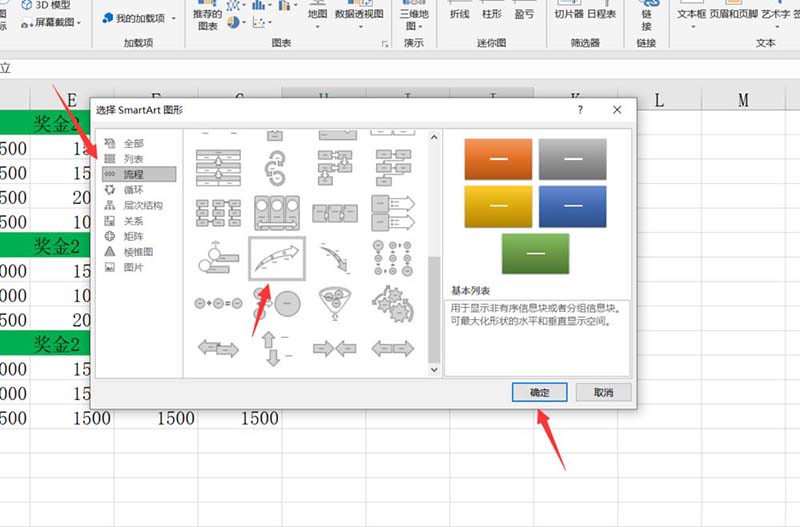 4、在Smartart的选择页面,我们选择流程并挑选一个向上的箭头,然后点击确定即可。