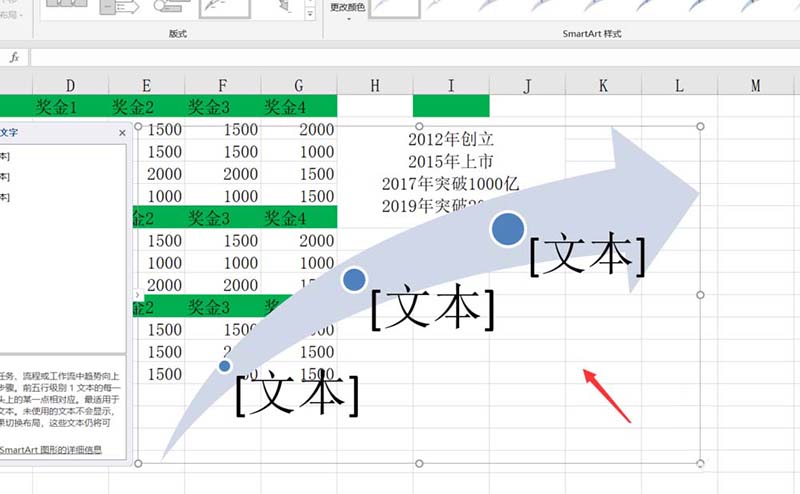 5、插入smartart向上箭头之后,我们可以看到就出现了一个大事件的时间轴。