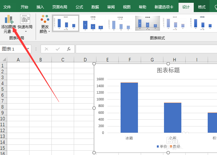 1、选中图表后单击“设计”选项卡,单击“添加图表元素”选项。