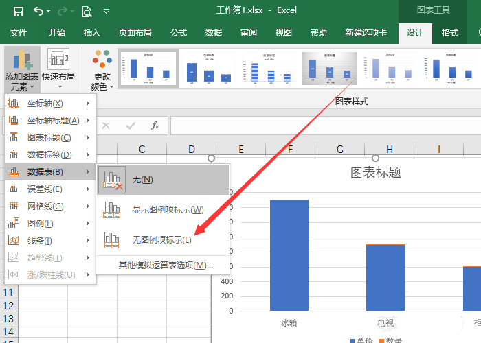 2、单击“数据表”选项,单击“无图例项标示”选项。
