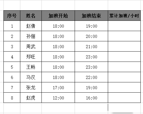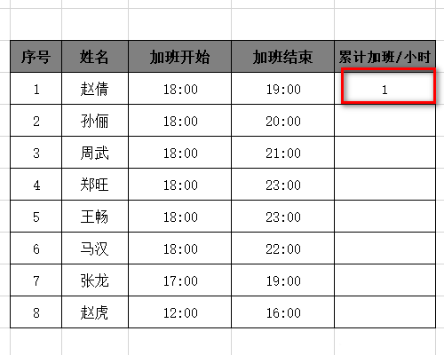 6、最后下拉填充公式,即可得到所有人的加班时间;