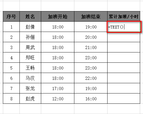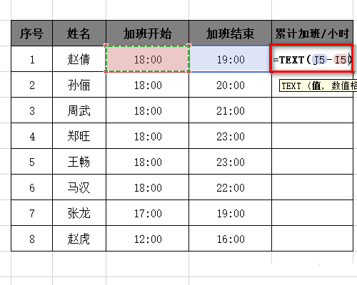 3、用加班结束时间减加班开始时间,次数函数为:=TEXT(J5-I5);