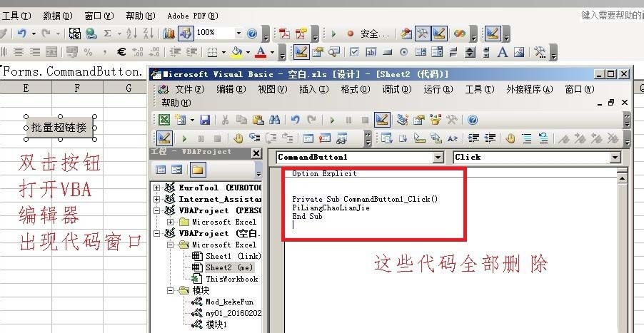 4、双击按钮控件,打开代码编辑VBA窗口;删除全部显示的代码。