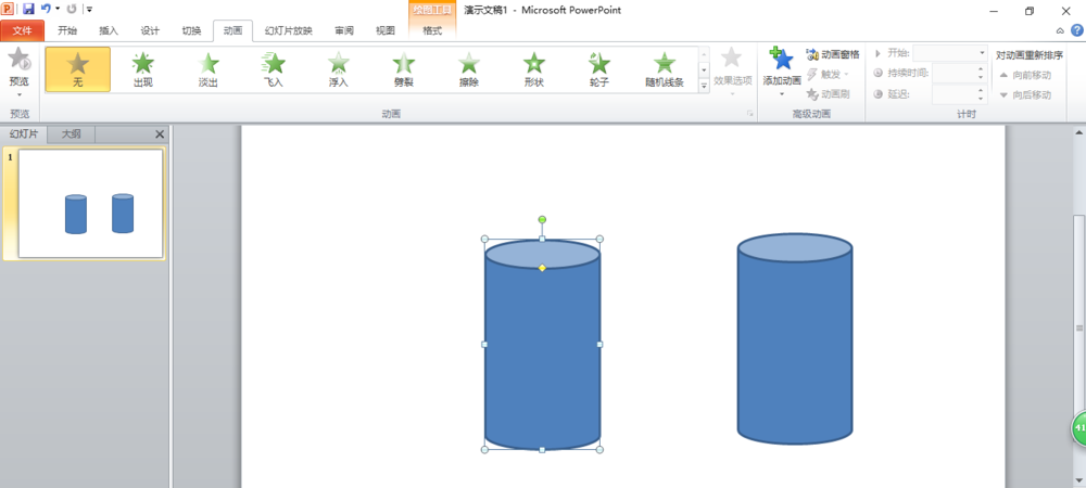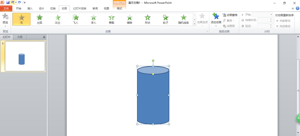 1、打开PPT2010,从“形状”中插入一个圆柱形。