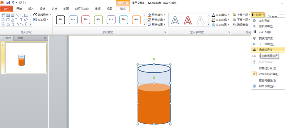 5、框选两个圆柱形,把它们“左右居中”、“底端对齐”进行对齐。