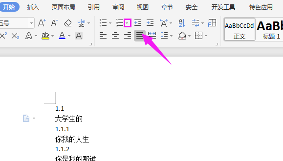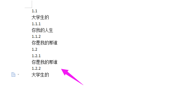 2、接着我们输入标题作为演示,我们假设【1.1-1.2】为一级标题,【1.1.1-1.1.2-1.2.1-1.2.2】为二级标题,如图。