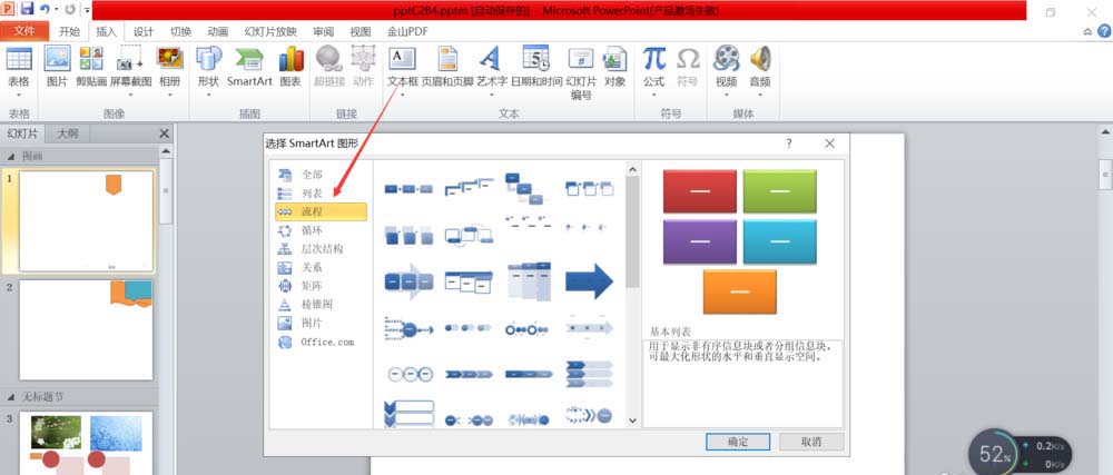 4、弹出来的smartart对话框里面找到流程选项,如下图所示。