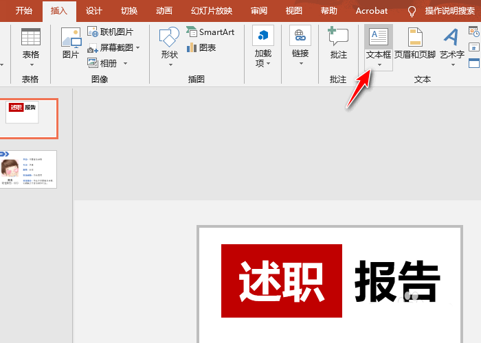 7、插入横排文本框,输入:报告;将其放在述职右侧。