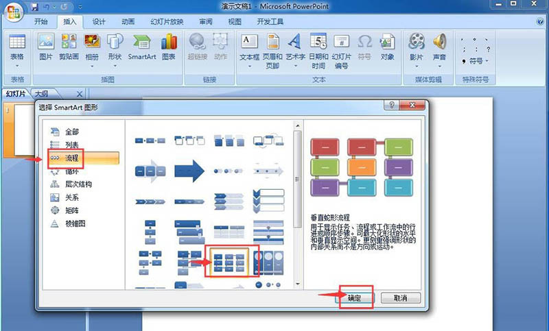 5、在流程类别中找到并点击垂直蛇形流程图,按确定;