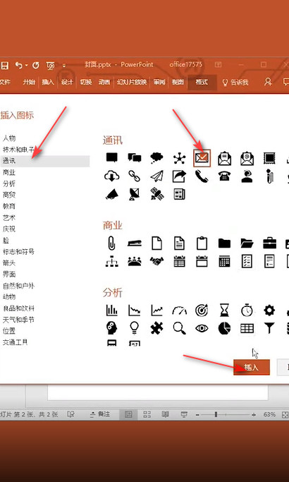 5、在图标界面点击“通讯”,选择“信封”图标,点击“插入”。