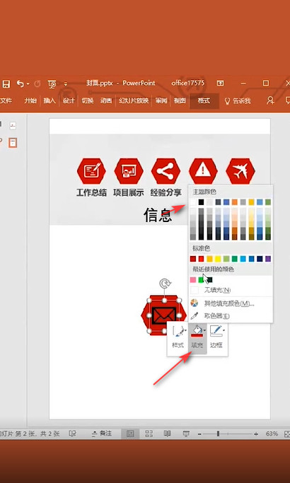 6、将“信封”图标移动到六边形中间,鼠标“右键”设置填充颜色为“白色”。