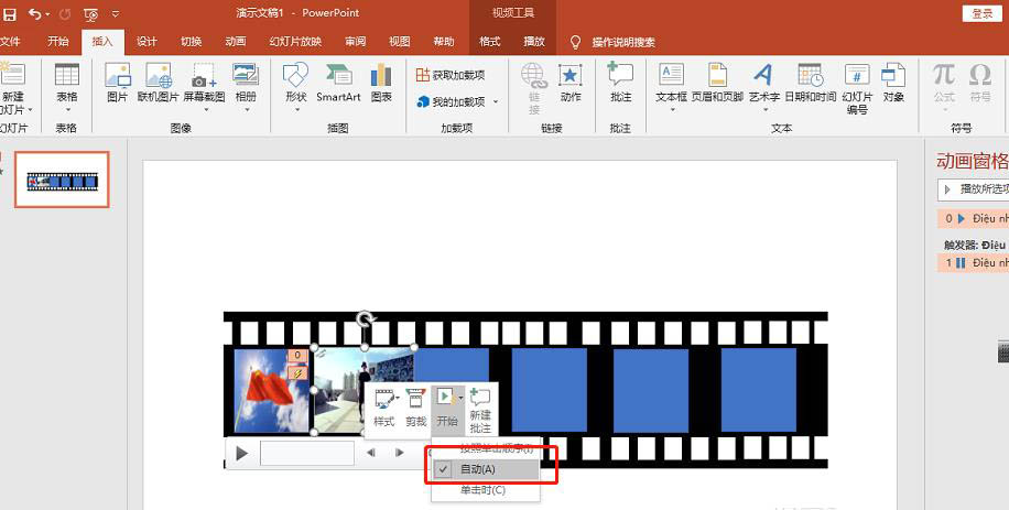 5、在矩形中还可以“插入-视频”选中视频右键“开始-自动”即可实现视频自动播放