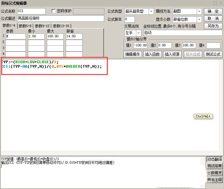 CCI:(TYP-MA(TYP,N))/(0.015*AVEDEV(TYP,N));