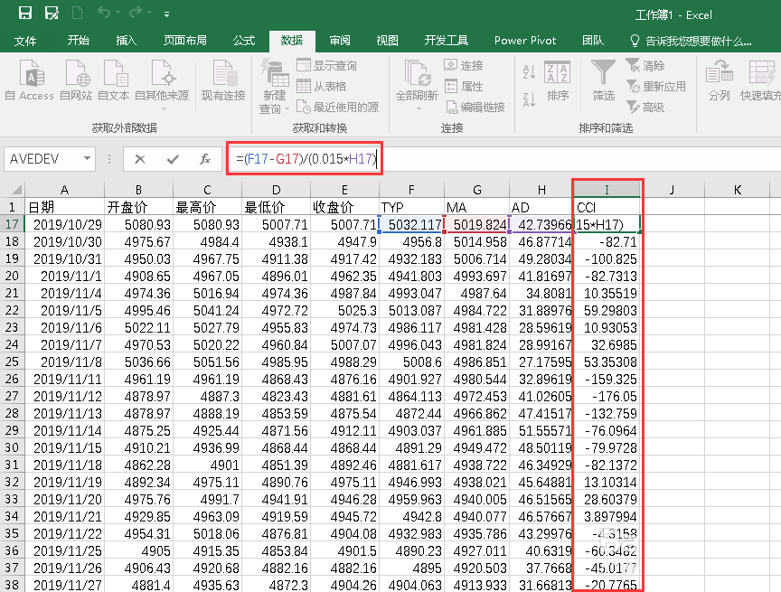 6、最后用公式计算 (TYP-MA)/(0.015*AD) 就得到CCI 值,把计算出来的CCI值放在最后一列就完成了。