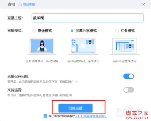 第四步输入直播主题,选择直播模式,一般讲课选择屏幕分享模式,点击创建直播,如下图所示: