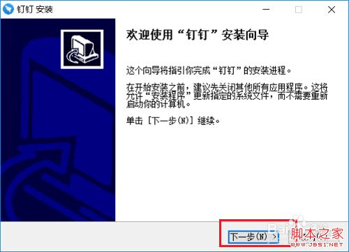 第三步加载一会儿之后,进去钉钉安装界面,点击下一步,如下图所示: