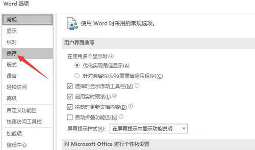 打开Word选项的对话框之后,点击左侧列表中的“保存”,如图。