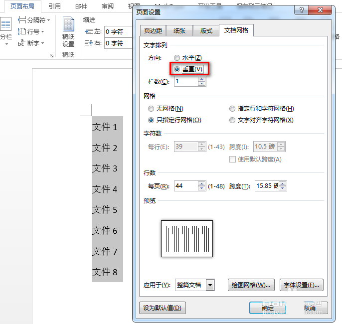 3、在弹出的对话框中,在“文档网格”下选中“垂直”,最后点击“确定”,具体如图所示: