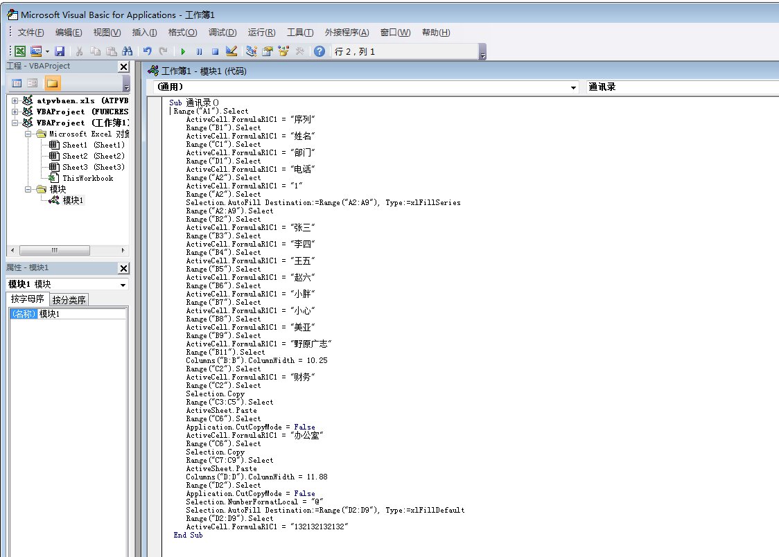 4、写入制作通讯录的VBA代码。主要利用“Type:=xlFillSeries”、“Range”和“ActiveCell.FormulaR1C1”。