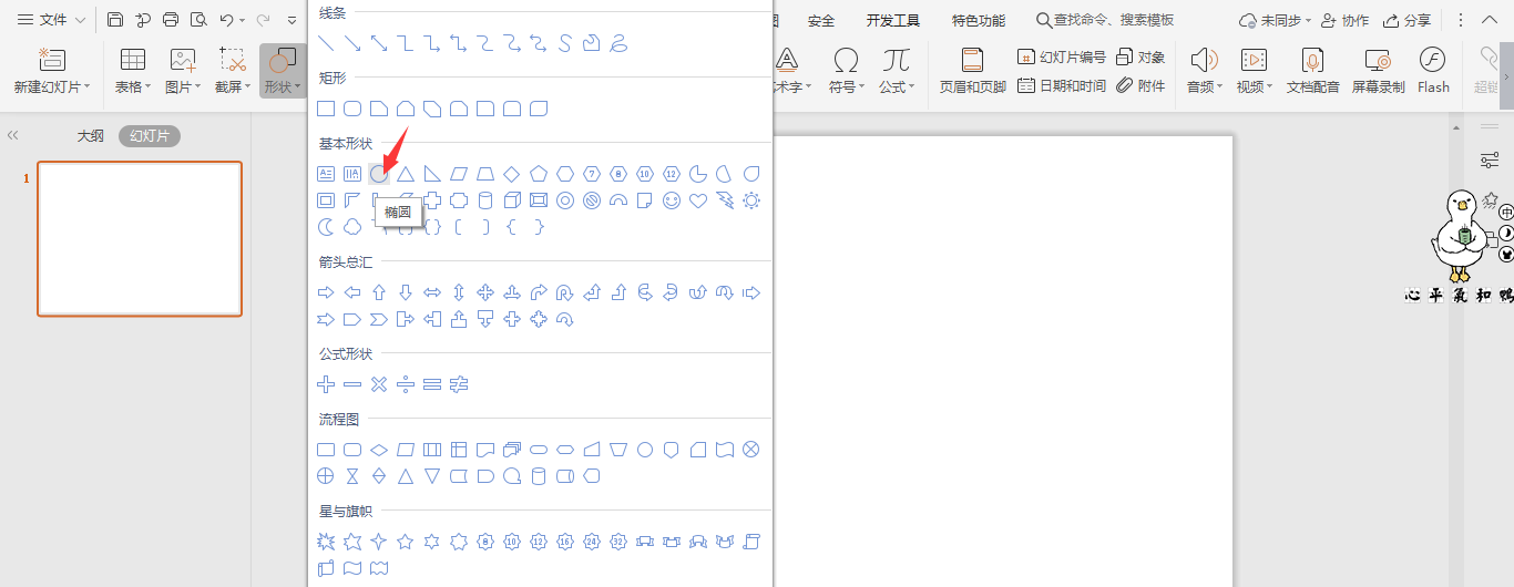 1、在插入选项卡中点击形状,选择其中的椭圆。
