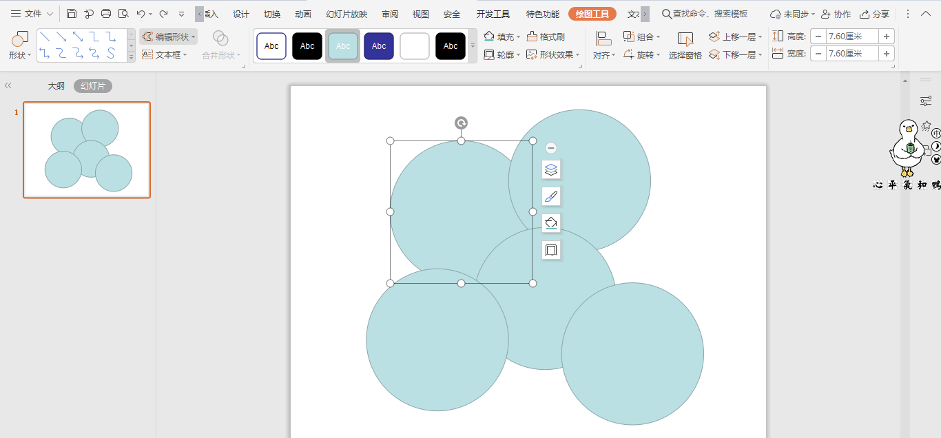 3、选中圆形,鼠标拖动,把大小不等的圆形摆放至如图所示的位置。
