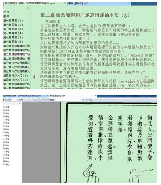 1、这里以pdf和epub文件为例,这两个采用不同的样式,我们可以看到pdf背景色是白色的,看就了比较伤眼睛,而EPUB的默认背景色偏红,这里我们都不太满意,我们把它们改为绿色的护眼色;
