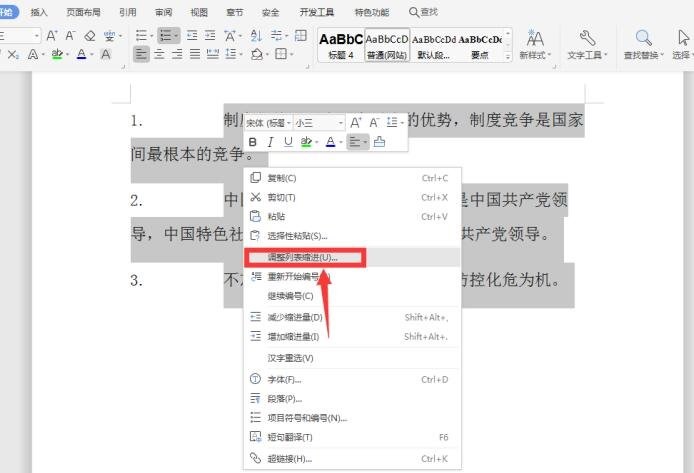 2、选中所有的文字,右键弹出下拉菜单,点击【调整列表缩进】;