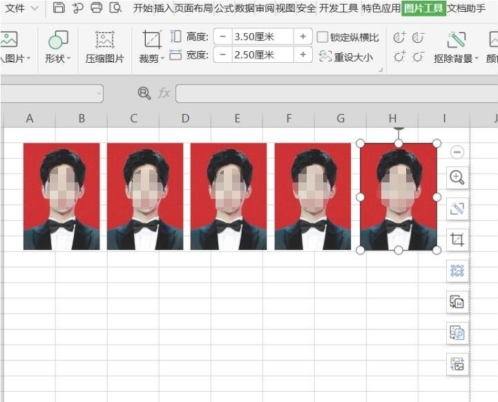 3、选中图片,点击图片工具,将高度和宽度进行调整,一寸照片高度是3.5厘米,宽度是2.5厘米,二寸照片高度是4.9厘米,宽度是3.5厘米;