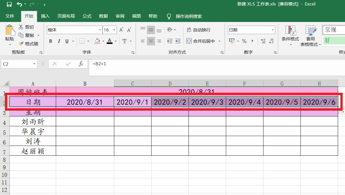 4、选中第二个单元格,向后面拖拽,七天的日期就自动生成了。