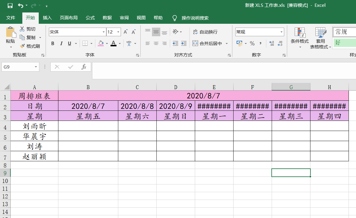 1、打开Excel,我们制作了一个下图这样的排班表,第一行第二列就是排班的开始日期。