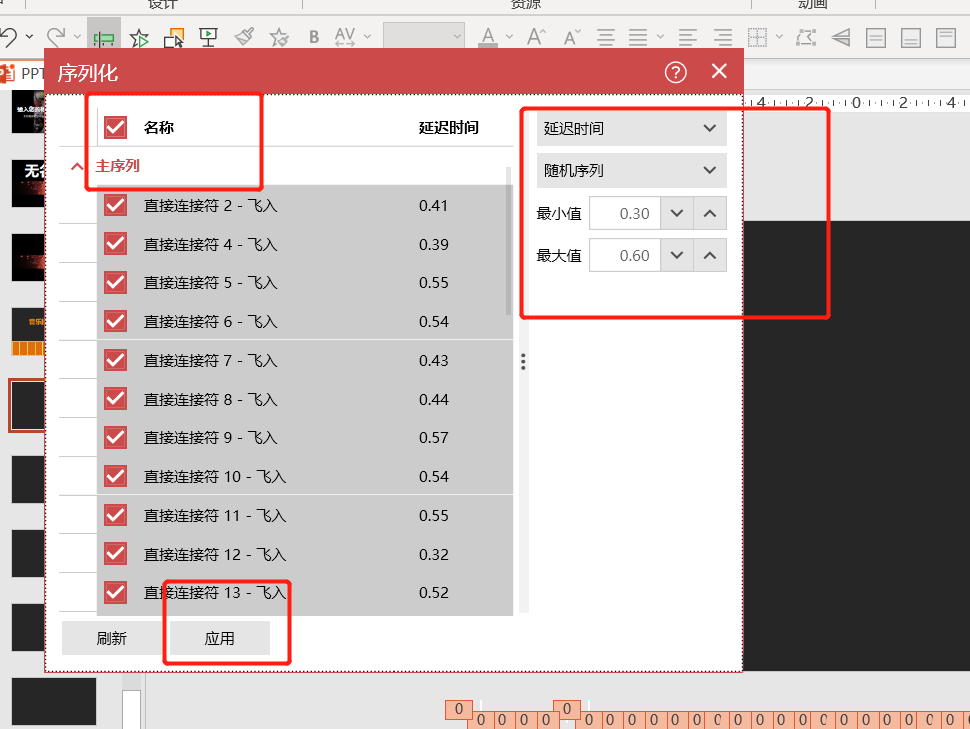 6、选择【动画时长】-【随机序列】-【最小值0.6,最大值0.8】-【勾选名称】-【应用】,如图7