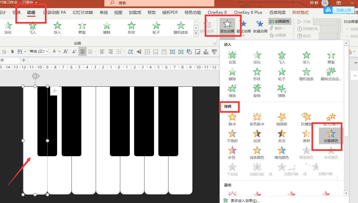 1、点击第一个白色琴键-动画-添加动画-强调-对象颜色,一共添加两次这个动画。如图9